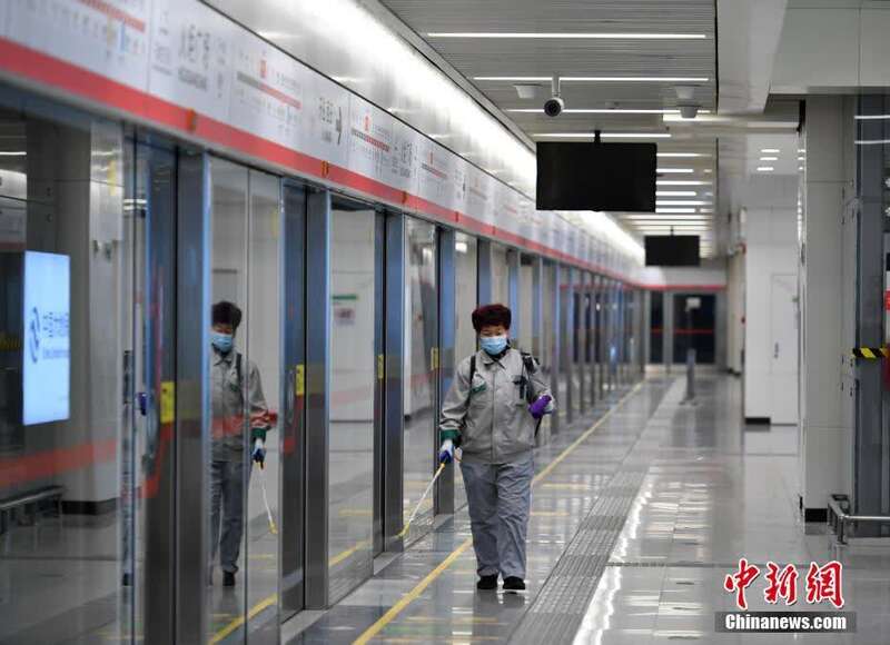↑资料图:2月1日,河北石家庄,工作人员在地铁站台上进行消杀工作。 中新社记者 翟羽佳 摄