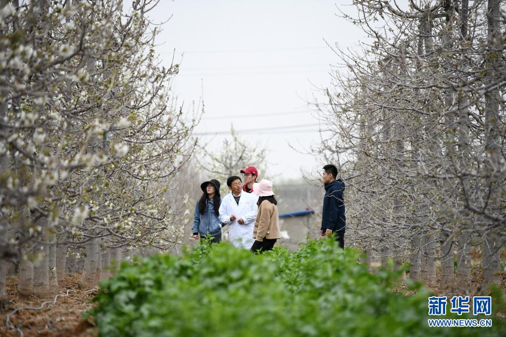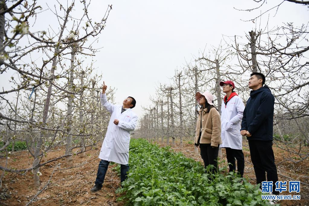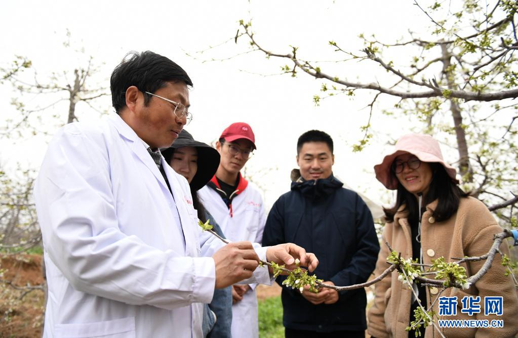 3月25日,西北农林科技大学园艺学院教授蔡宇良(左二)在铜川果树试验示范站为学生讲授樱桃园春季管理。