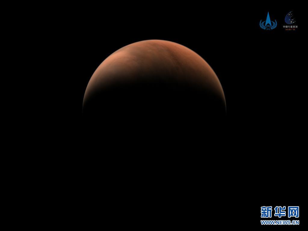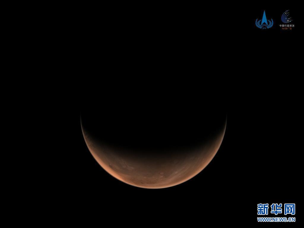 3月26日,国家航天局发布2幅由我国首次火星探测任务“天问一号”探测器拍摄的南、北半球火星侧身影像。图像中,火星呈“月牙”状,表面纹理清晰。
