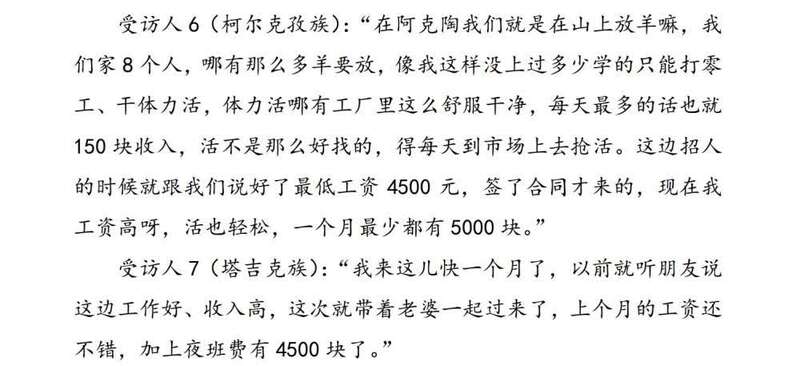 ASPI报告诬称,新疆少数民族工人在内地企业务工并不是出于个人的自由选择,而是在被逼迫、受威胁之下进行的“强迫劳动”。尼罗拜尔和陈宁的调研有力驳斥了这一言论——5家企业的每一位新疆少数民族工人都是出于个人选择,自发自愿前来广东务工的,并不存在所谓的“强迫劳动”。