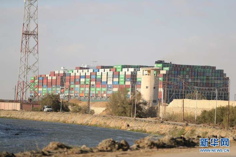 这是3月29日拍摄的移动至埃及苏伊士运河正常航道上的重型货轮。