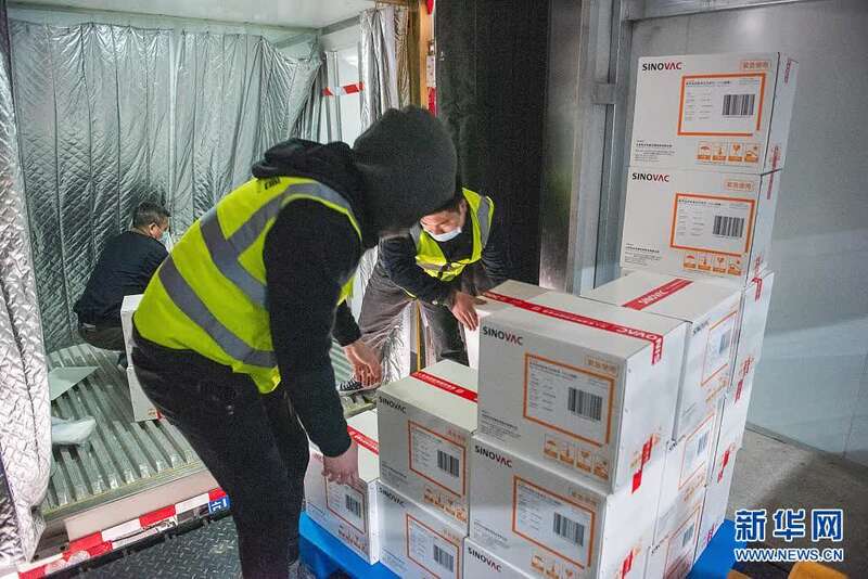 4月1日,北京科兴中维生物技术有限公司工作人员将新冠疫苗克尔来福搬上冷链货车。这批克尔来福将运往海南,支持当地新冠疫苗接种工作。