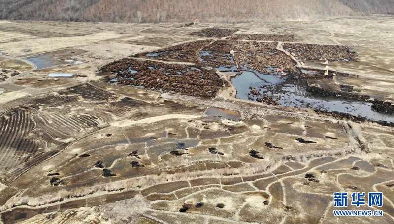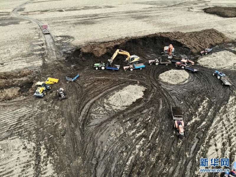 3月29日,在黑龙江省五常市沙河子镇福太村,工作人员在回填被盗挖的黑土(无人机照片)。新华社记者 马知遥 摄
