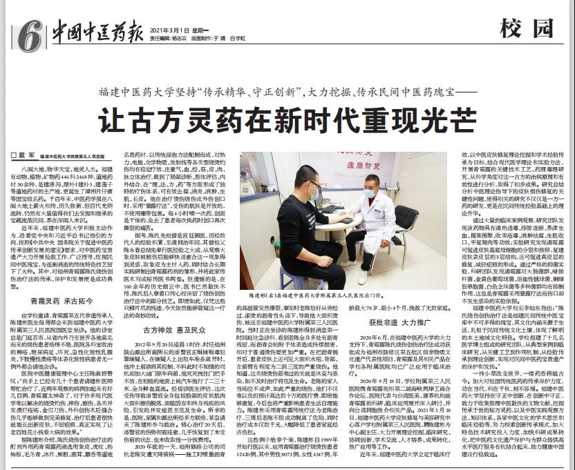 近年来,福建中医药大学积极主动作为,沿着党中央和习近平总书记指引的方向,按照《中共中央 国务院关于促进中医药传承创新发展的意见》要求,对中医药宝贵遗产大力开展抢救工作,广泛搜寻、挖掘民间中医瑰宝,为逐渐消逝的传统特色技艺留下了火种。其中,对福州青霜露陈氏烧伤创伤治疗法的传承、保护和发展便是成功典型。