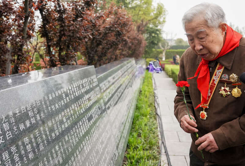 4月2日,新四军老战士刘天同在纪念墙前向老战友献花。新华社记者丁汀摄