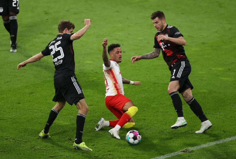 4月3日,莱比锡队球员尤斯廷·克鲁伊维特(中)和拜仁慕尼黑队球员卢卡斯·埃尔南德斯(右)、穆勒拼抢。