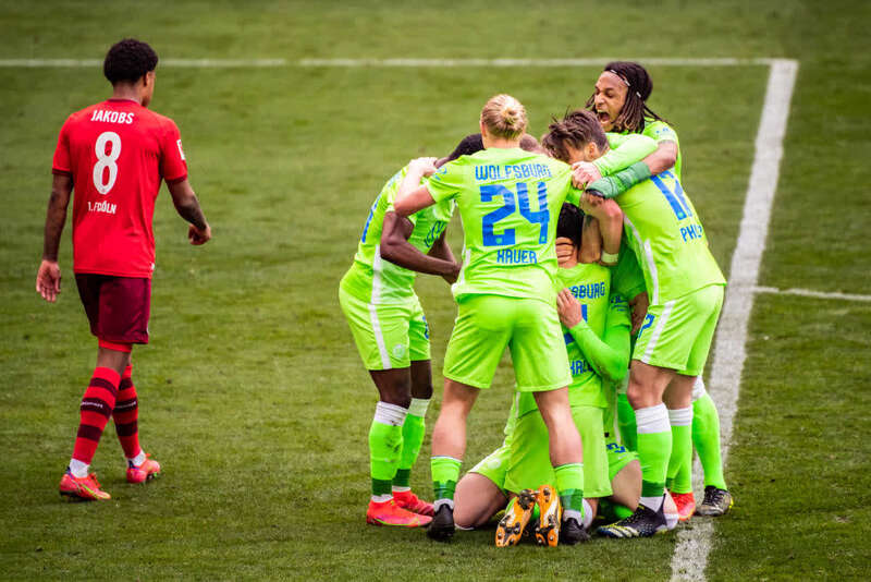 4月3日,沃尔夫斯堡队球员在比赛中庆祝进球。新华社发(凯文·福格特摄)