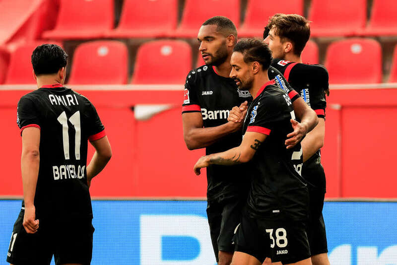 4月3日,勒沃库森队球员希克(右一)在比赛中进球后与队友庆祝。新华社发