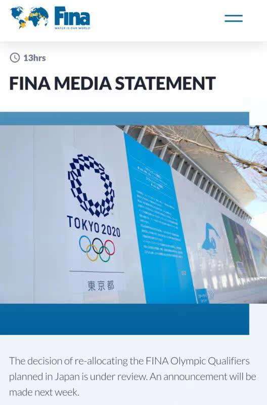 国际泳联原计划跳水、花样游泳和马拉松游泳都将在日本举行奥运资格赛,因为在2019年韩国光州举行的游泳世锦赛上,大部分奥运门票都已经有了归属,只有一些剩余名额需要在今年的奥运资格赛中产生。