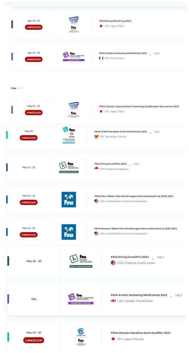 国际泳联取消的其他几项国际赛事包括:4月23日至25日在法国巴黎举行的花样游泳世界系列赛第四站、5月9日在塞舌尔举行的马拉松游泳世界系列赛、5月24日至31日在美国印第安纳举行的男子和女子水球世界联赛洲际杯赛。