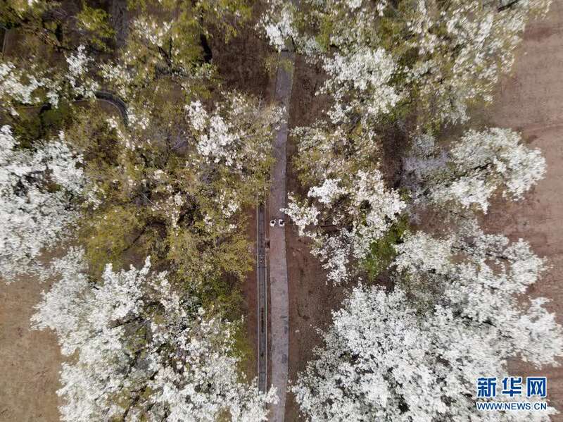 4月3日,游客在中卫市南长滩村观赏盛开的梨花(无人机照片)。