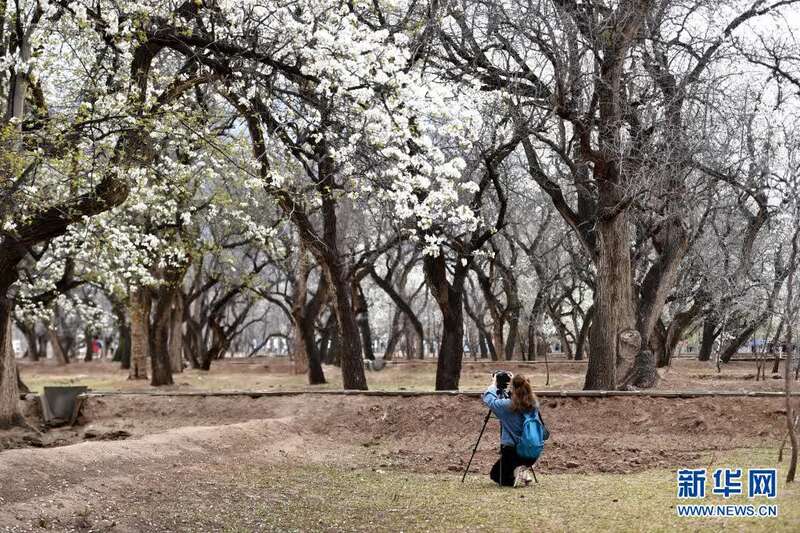4月3日,游客在中卫市南长滩村拍摄盛开的梨花。