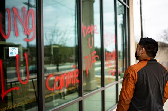 3月14日,美国得克萨斯州一家亚裔人经营的餐馆遭人恶意破坏,餐馆的玻璃外墙上被涂满了种族歧视和攻击性言语。店主迈克表示,“这些攻击性言语,可能会升级为对我的肢体攻击,甚至可能是致命的,那对我来说将会更加糟糕。”