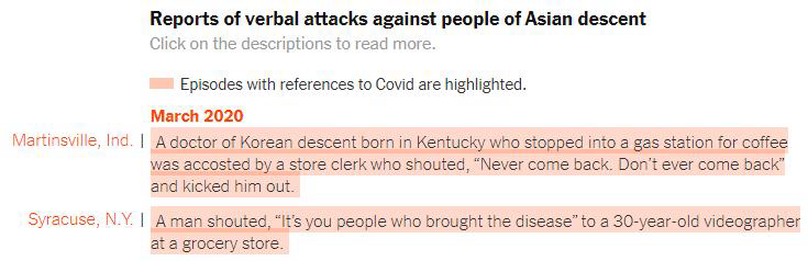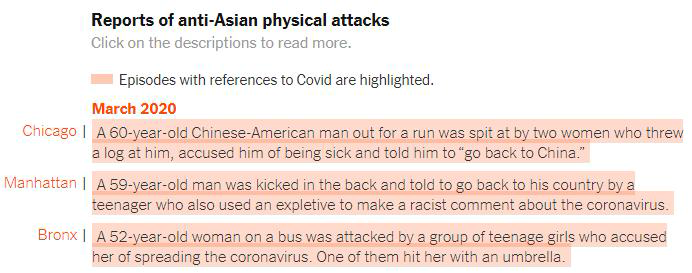 在这篇题为《愈演愈烈的反亚裔暴力:他们在这里受到攻击》的长篇报道中,《纽约时报》整合了2020年3月至2021年3月亚裔美国人遭受攻击骚扰的媒体报告。