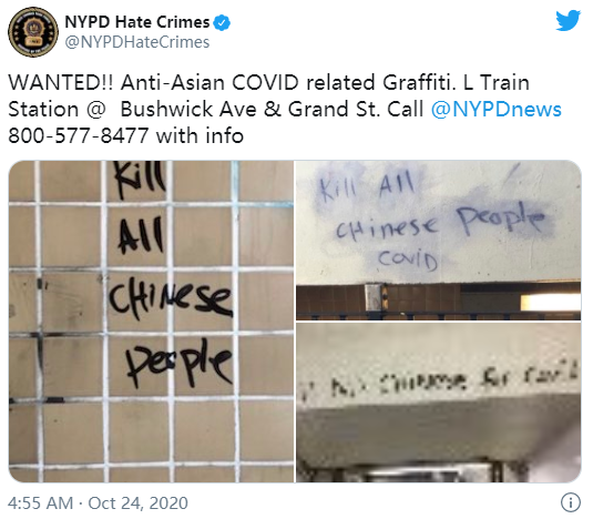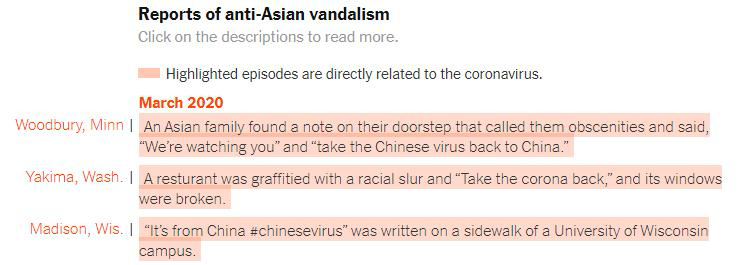通过对全国各地媒体报道进行搜集分析整理,《纽约时报》发现,自2020年3月以来,有明显证据表明存在种族仇恨的事件超过110起。