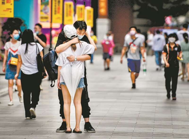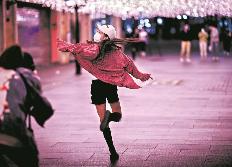 2020年4月24日晚,汉街一位高兴得跳起来的女孩