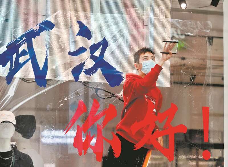 2020年4月10日,汉街一商铺橱窗贴上了“武汉你好”