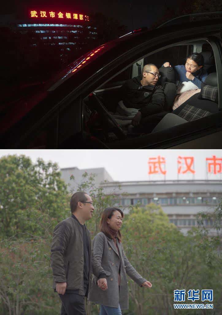 这是一张拼版照片,上图为:2020年2月22日晚,武汉市金银潭医院的医护夫妻涂盛锦(左)与曹珊在车内聊天。从大年初一开始,两人就住进车里,为在疫情中抢救病患,争分夺秒,以车为家;下图为:3月23日,武汉市金银潭医院的医护夫妻涂盛锦和曹珊在下班路上。新华社记者 熊琦 摄