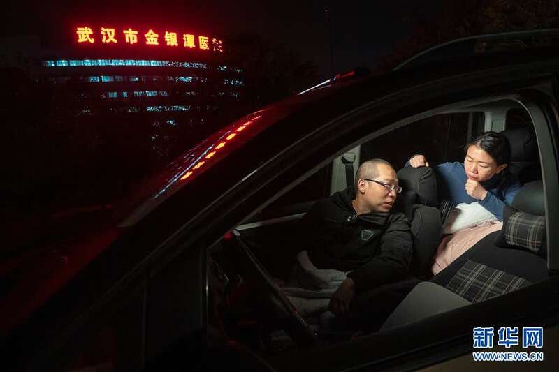 2020年2月22日晚,武汉市金银潭医院的医护夫妻涂盛锦(左)与曹珊在车内聊天。从大年初一开始,两人就住进车里,为在疫情中抢救病患,争分夺秒,以车为家。新华社记者 熊琦 摄