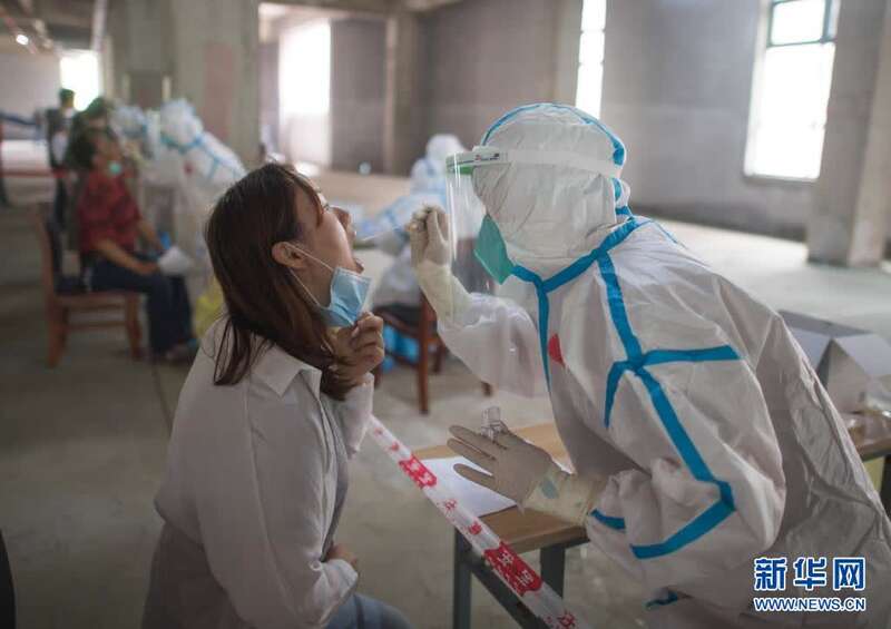 2020年5月15日,在武汉华生汉口城市广场四期检测点,工作人员对市民进行核酸检测。新华社记者 肖艺九 摄
