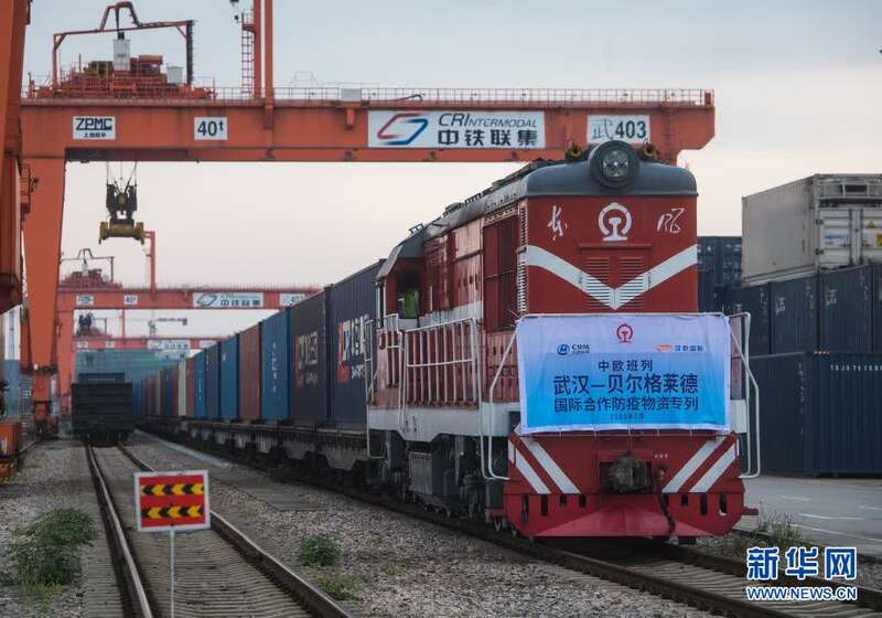 2020年5月9日,开往塞尔维亚贝尔格莱德的中欧班列(武汉)准备从吴家山站驶出,该班列满载3500立方米、294.42吨国际合作防疫物资,支援塞尔维亚及周边国家抗击新冠肺炎疫情。新华社记者 肖艺九 摄