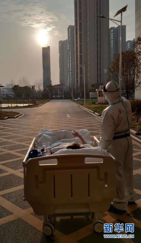 2020年3月5日傍晚,在湖北省武汉大学人民医院东院,复旦大学附属中山医院支援湖北医疗队医生在护送患者王欣做CT的途中停下,让住院近一个月的老人欣赏久违的日落。新华社发(甘俊超 摄)