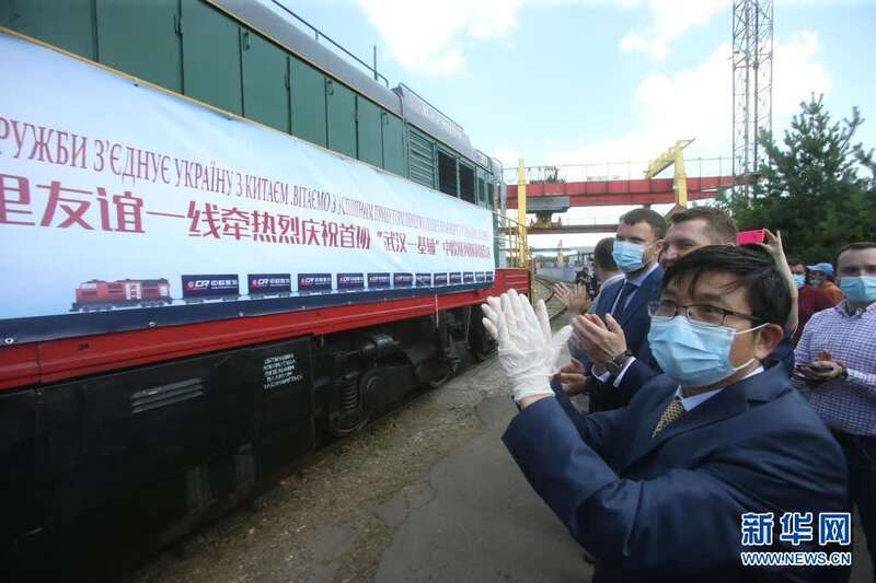 2020年7月6日,在乌克兰首都基辅市利斯基货运站,中乌两国代表迎接“武汉—基辅”中欧班列。该班列是中国华中地区首列直达乌克兰的中欧班列。新华社发(谢尔盖·斯塔拉斯坚科摄)
