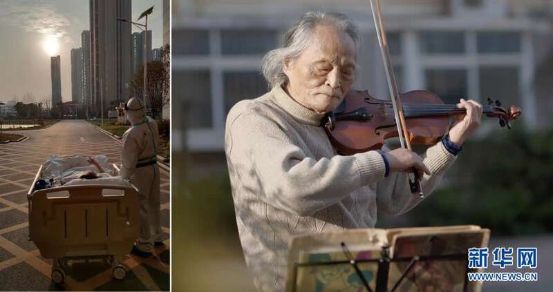 这是一张拼版照片,左图为:2020年3月5日傍晚,在湖北省武汉大学人民医院东院,复旦大学附属中山医院支援湖北医疗队医生在护送患者王欣做CT的途中停下,让住院近一个月的老人欣赏久违的日落(甘俊超 摄);右图为:3月24日,“看夕阳的老人”王欣在东西湖区园艺花城小区内拉小提琴(新华社记者熊琦摄)。新华社发