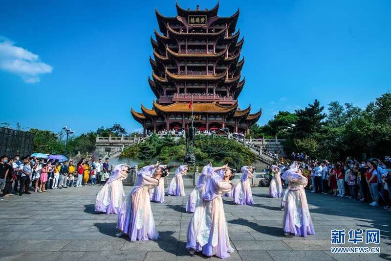 2020年10月1日,游客在武汉黄鹤楼景区观看演出。新华社记者 肖艺九 摄