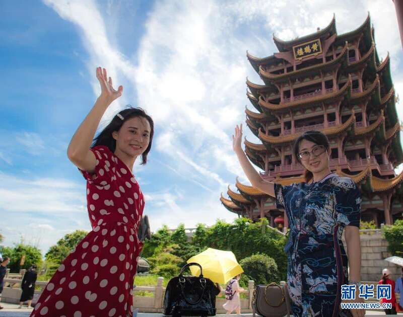 2020年8月7日,受邀来湖北旅游的海南援鄂医疗队员陈小妹(左)与同事计超在黄鹤楼景区观光。湖北省组织“与爱同行 惠游湖北”活动,陆续邀请援鄂医护人员代表以及湖北医护人员、社区工作者、志愿者等走进景区,饱览荆楚风貌。新华社记者 肖艺九 摄