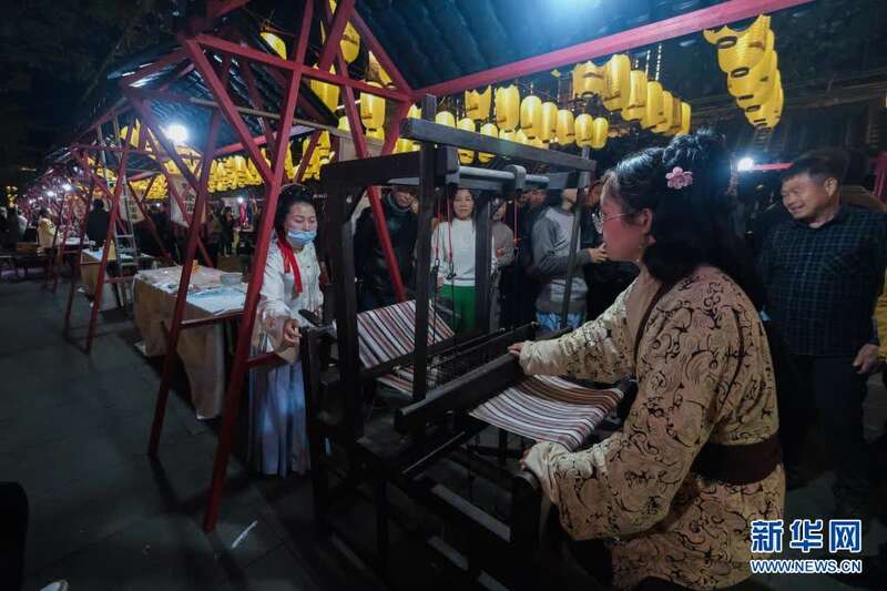 4月7日,临海的台州府城文化旅游区的工作人员身着传统服饰操作传统织布机,这也是紫阳街夜游项目之一。新华社记者 徐昱 摄