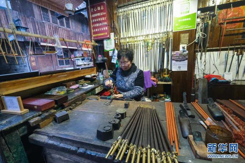 4月7日,在临海的台州府城文化旅游区紫阳街上,技艺传承人正在展示永利木杆秤制作技艺。新华社记者 徐昱 摄