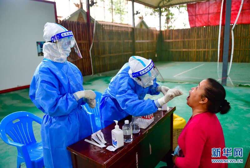 4月6日,在瑞丽市目瑙社区一核酸检测点,医务人员在进行核酸采样工作。新华社记者 陈欣波 摄