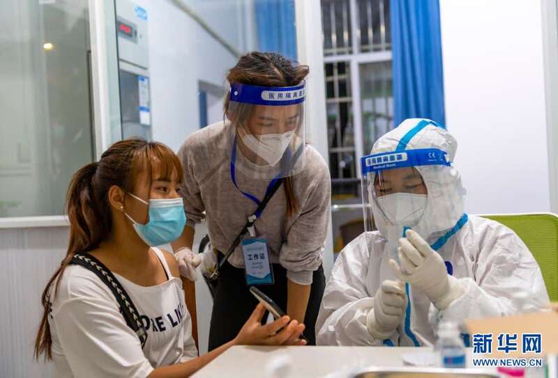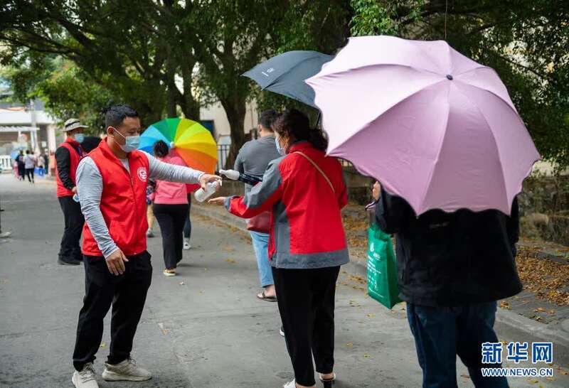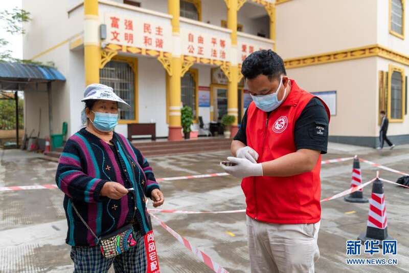 4月6日,在瑞丽市目瑙社区一核酸检测点,志愿者为前来做核酸检测的居民做手部消毒。新华社记者 陈欣波 摄