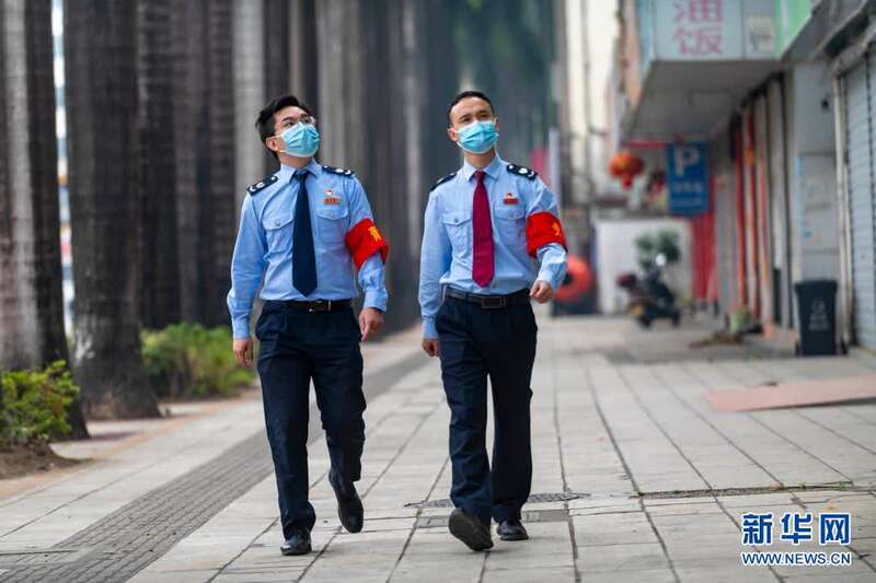4月5日,两名网格员在瑞丽市一街道巡查。新华社记者 陈欣波 摄
