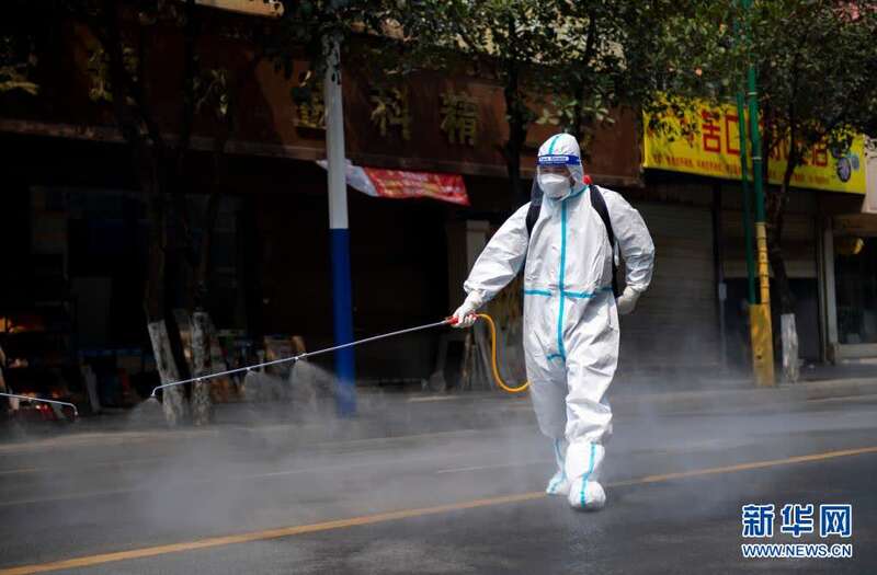 4月7日,工作人员在对瑞丽市一街道进行消毒。新华社记者 陈欣波 摄