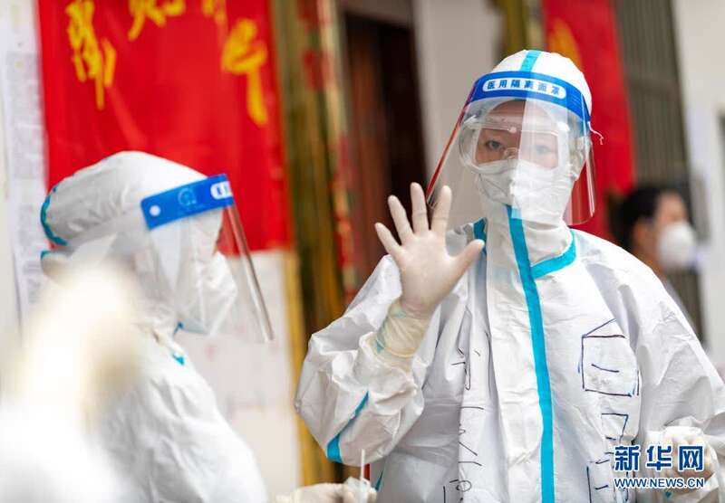 4月6日,在瑞丽市友谊社区一核酸检测点,一名医务人员通过手势和同事交流。新华社记者 陈欣波 摄