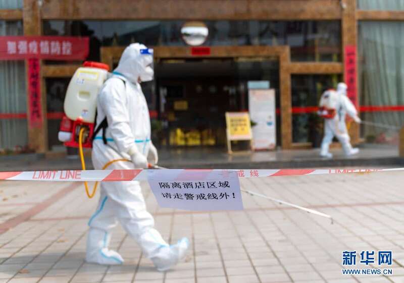4月7日,工作人员在对瑞丽市一集中隔离医学观察点外围进行消毒。新华社记者 陈欣波 摄