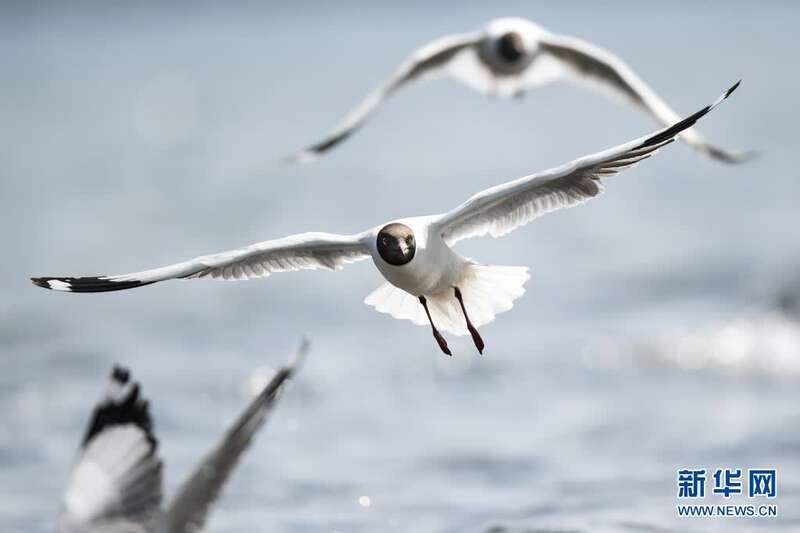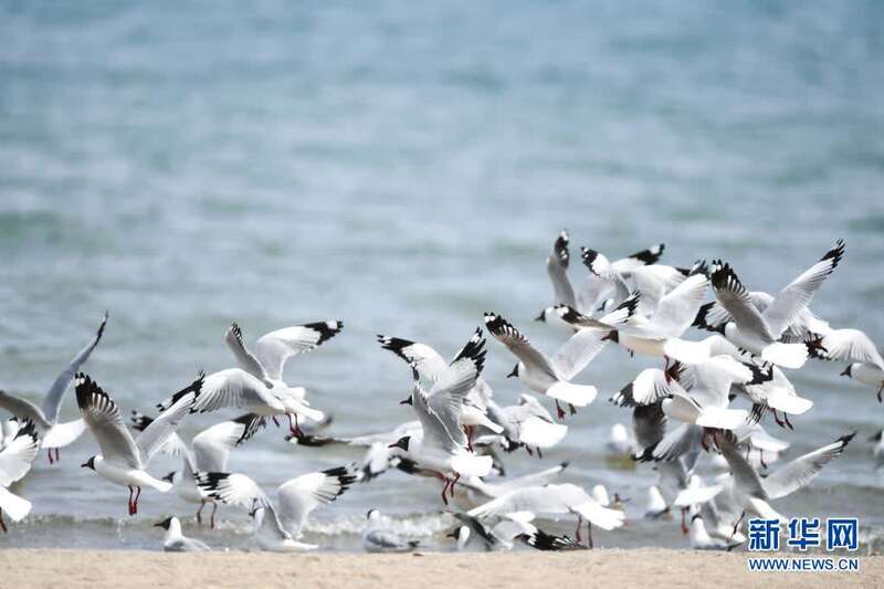 4月8日,一群棕头鸥在青海湖岸边飞翔。新华社记者 吴刚 摄