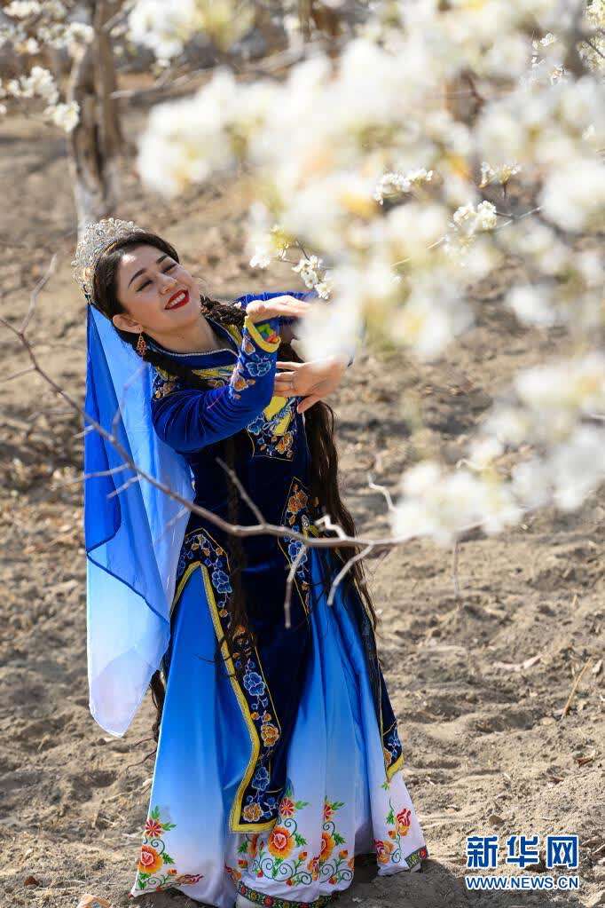 4月10日,在新疆库尔勒市阿瓦提乡,一名舞蹈演员在梨花树下翩翩起舞。新华社记者 丁磊 摄