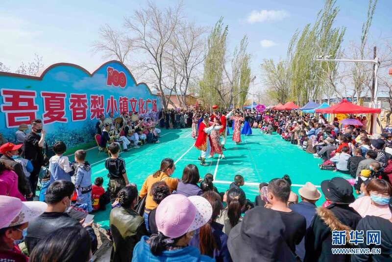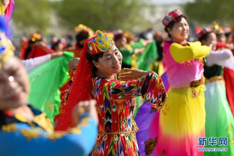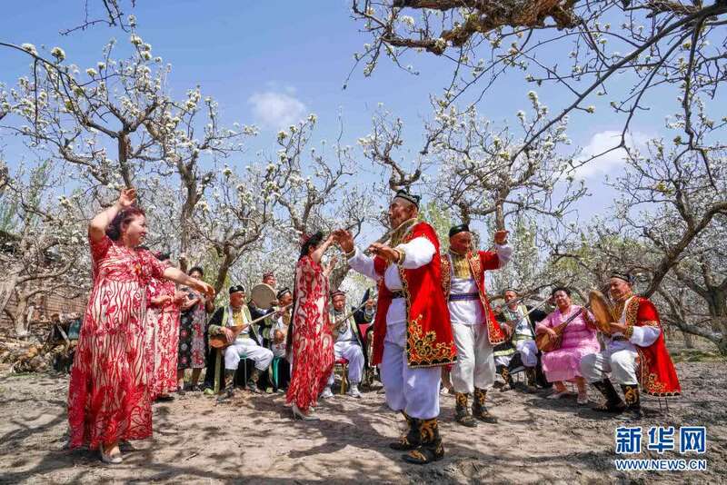 4月10日,在新疆库尔勒市阿瓦提乡,当地居民跳起舞蹈欢迎八方来客。新华社记者 赵戈 摄