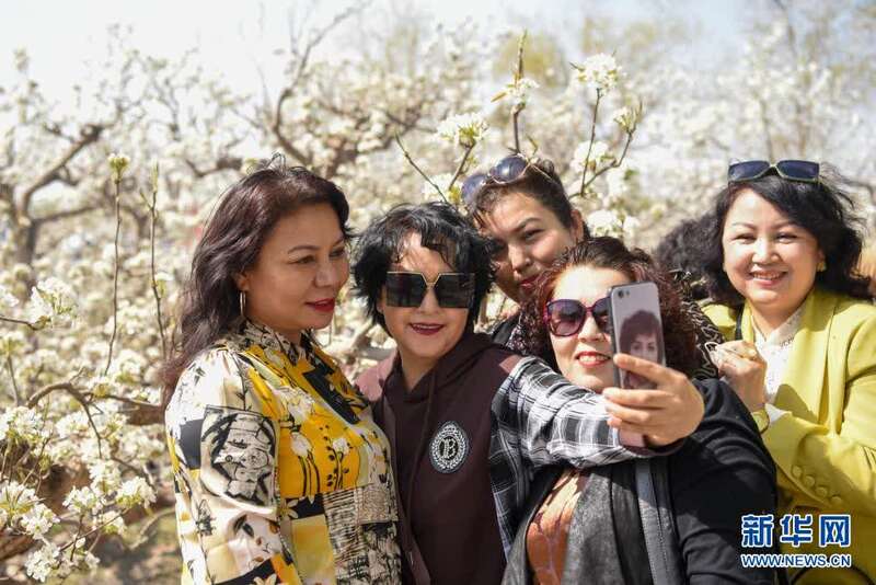 4月10日,游客在新疆库尔勒市阿瓦提乡拍摄盛开的梨花。新华社记者 丁磊 摄
