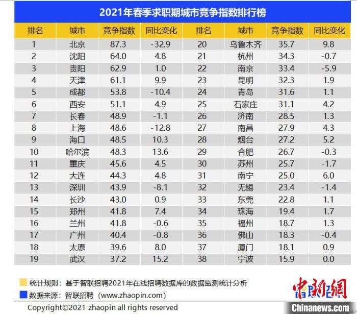报告称,在全国38个核心城市中,2021年春季求职期,北京竞争指数继续排在全国之首,为87.3。经历疫情后,武汉市就业市场快速恢复,竞争指数同比增幅最高,指数增长15.2,达到37.2。