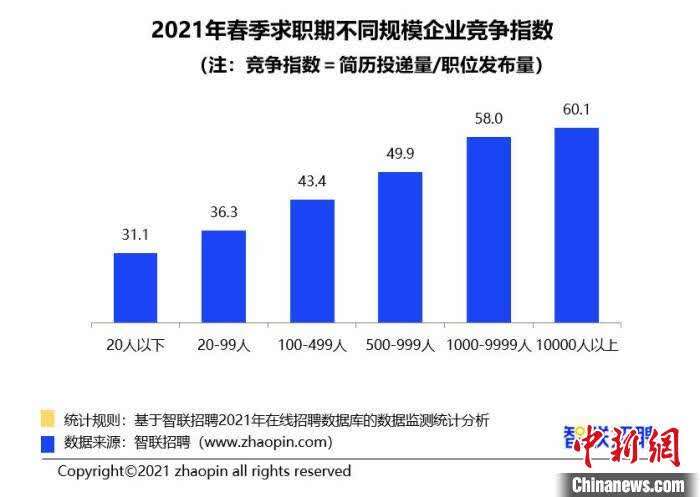 2021年春季求职期不同规模企业竞争指数。 智联招聘提供。