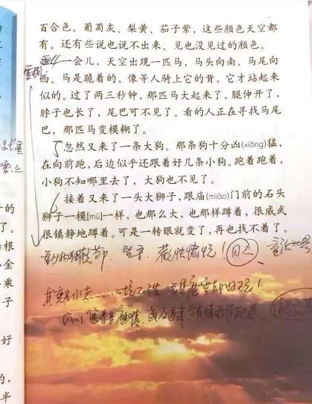 前述文章以《火烧云》一课为例,“原作开篇写道:‘晚饭一过,火烧云就上来了。’其中的‘一过’被改成‘过后’。这一时间副词改得没道理:‘一过’是表示‘刚一过去’,是一个短暂、明晰的时间概念;‘过后’则可能是一个较长的、模糊的时间段。对于很快就会消失的‘火烧云’,当然原作的‘一过’更恰切。接下来一句:‘照得小孩子的脸红红的。’课文在其前面加了‘霞光’二字,这完全违背作者的意志。萧红在原作中表示,‘说‘晚霞’人们不懂,若一说‘火烧云’就连3岁的孩子也会呀呀的往天空指给你看。既然当地人连‘晚霞’都不懂,怎么可能懂得其衍生出来的词‘霞光’呢?但编者很任性。之后是把原作的‘喂猪的老头子,往墙根上靠’,改作‘喂猪的老头儿在墙根靠着’。有过东北农村生活经验的人都知道,土墙的墙根很多是坡状的,所以‘往墙根上靠’是一个满有生趣的灵动影像,课文这一改却变成了呆板的静态画面,遮掩了原作语言的神采。