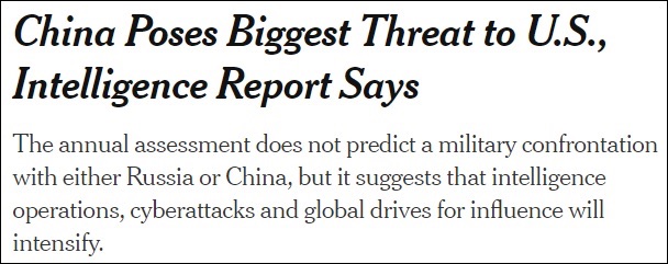 《纽约时报》:美国情报报告称,中国是美国“最大威胁”