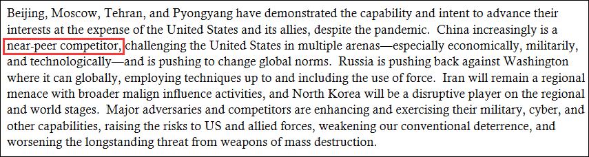 随后,美国更是把中国放在了“头号威胁”的位置上,报告形容中国正日益成为一个“近乎旗鼓相当的竞争对手”(near-peer competitor),并宣称中方在经济、军事和科技等多方面挑战美国,正试图改变全球准则。