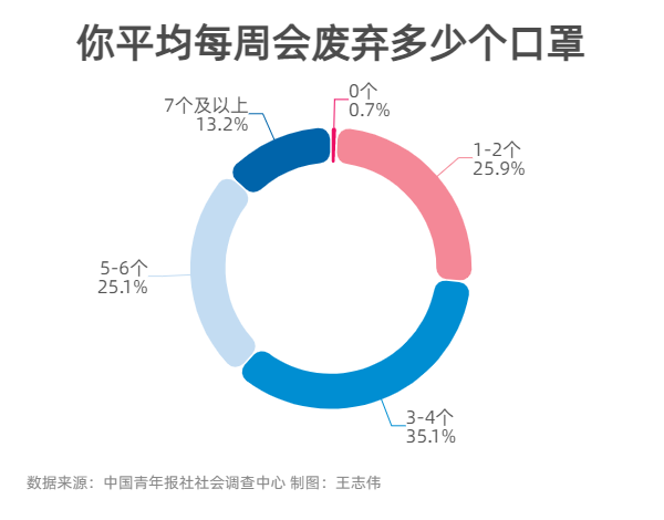 提及更换口罩的频率,调查显示,73.4%的受访者平均每周废弃3个及以上口罩。