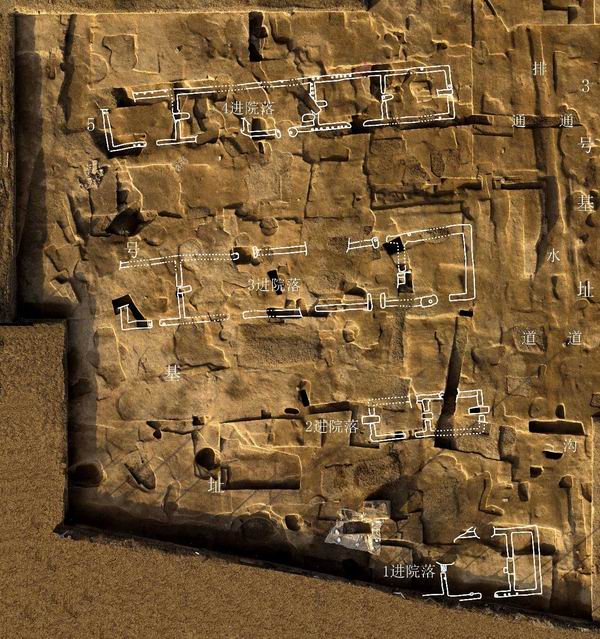 我们采取的办法是先揭开2号宫殿基址东北角,看看2米宽的东墙夯土是否继续向北延伸。同时还要看其在2号宫殿东南角以外是否也向南延伸,在确认它们向北向南延伸后,我们又扩大战果,继续向北向南一路追探,再辅之以探沟解剖予以确认。通过这种方式,能够确定这道夯土墙的长度已近300米,且发现了呈直角拐折的东北角,可以肯定其属宫城城垣无疑,而2号宫殿基址就是依托宫城东墙建成的。也就是说宫城就是通过先想然后再验证落实的。
