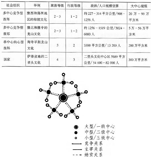 仰韶、龙山和二里头时期社会组织、聚落等级和行政等级的关系与二里头时期聚落模式(二里头聚落体系中的贡赋关系)示意图(引自:刘莉《中国新石器时代——迈向早期国家之路》,文物出版社,2007年,第221-222页)